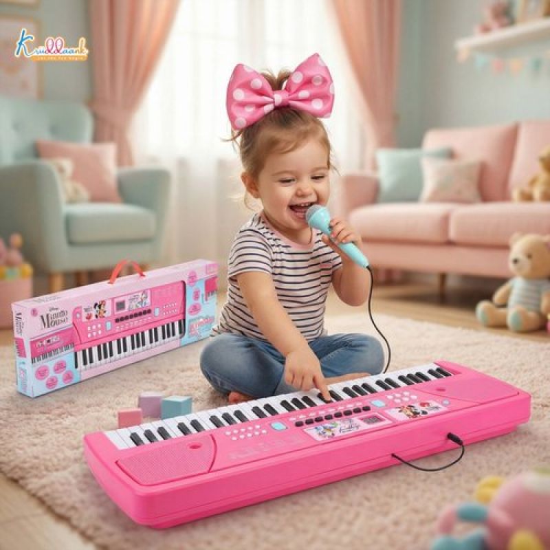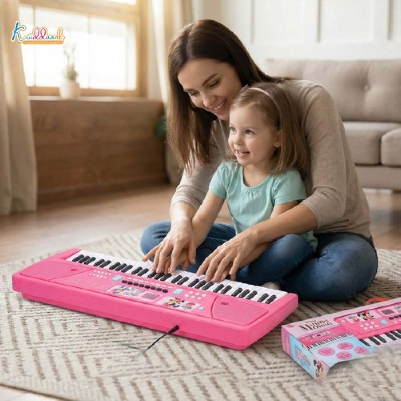Disney Minnie Mouse 61-Key Keyboard Piano for Kids - Musical Toy with Microphone, Digital Screen, 17 Instrument Sounds, Recording Mode & USB Power - Pink Educational Gift for Toddlers Age 3+