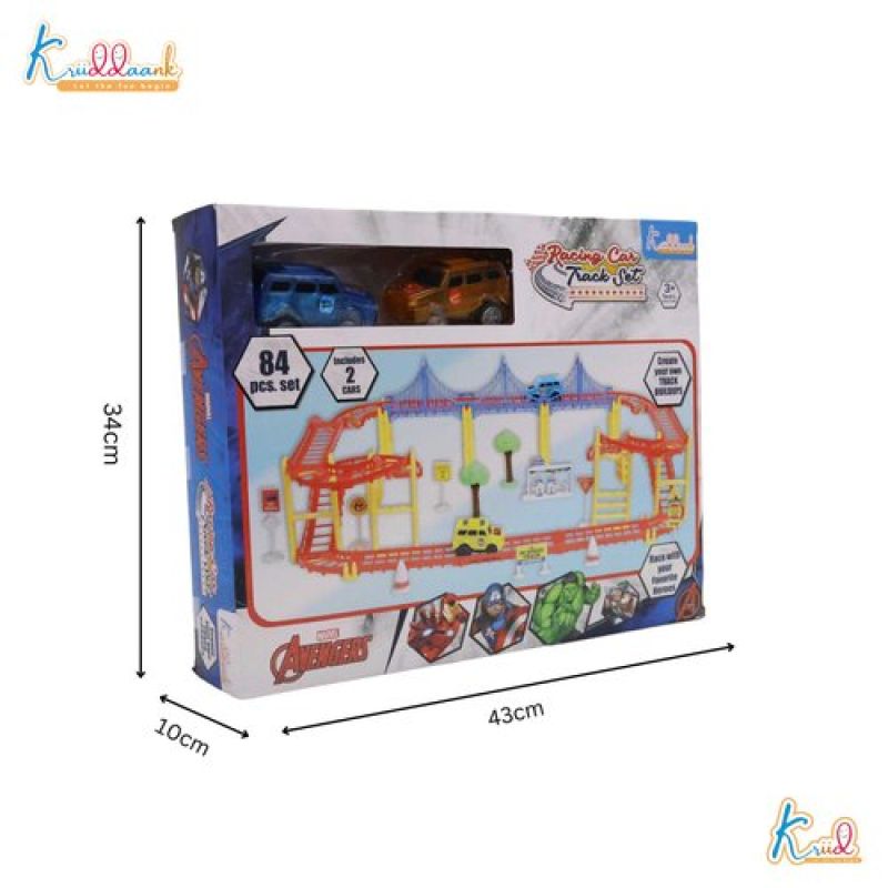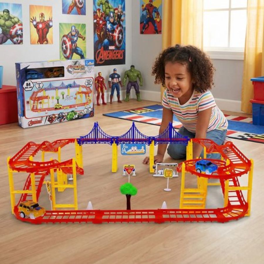 Avenger Theme Portable Car Track Playset - 86 Pcs Marvel Racing Track with Diecast Metal Cars, DIY Customizable Race Track for Kids 3+ Years, Realistic Miniature Collectible Toy (Multicolor)