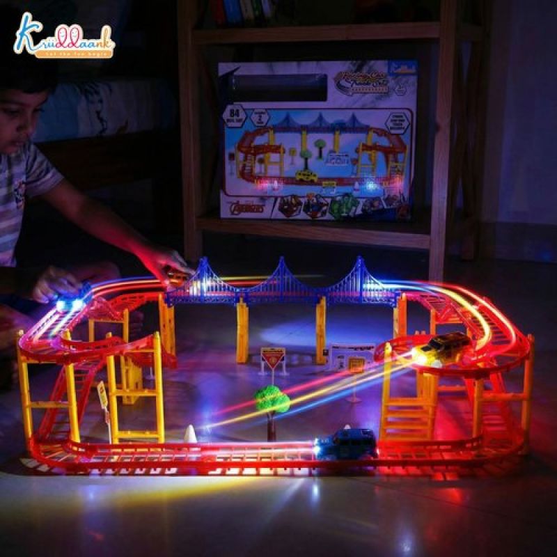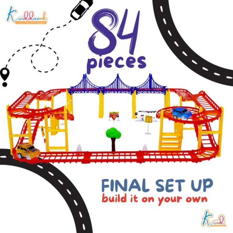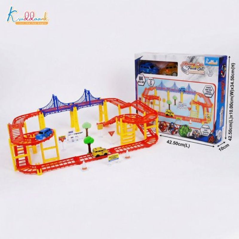 The set includes 41 pieces of track that can be assembled in a variety of configurations to create a custom race track.
