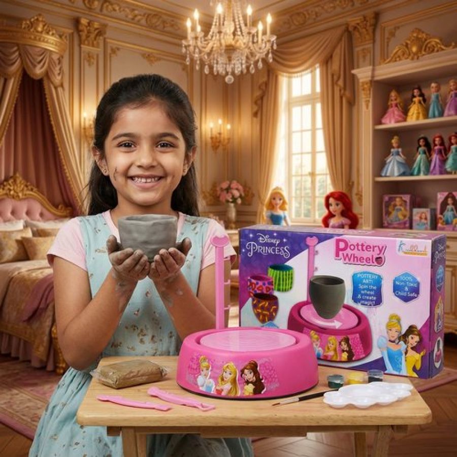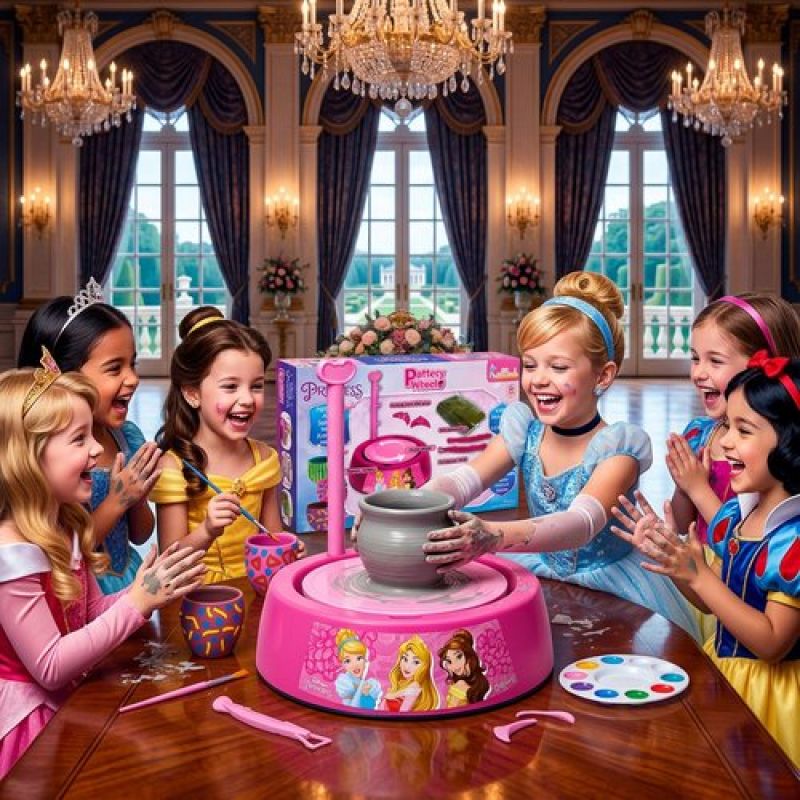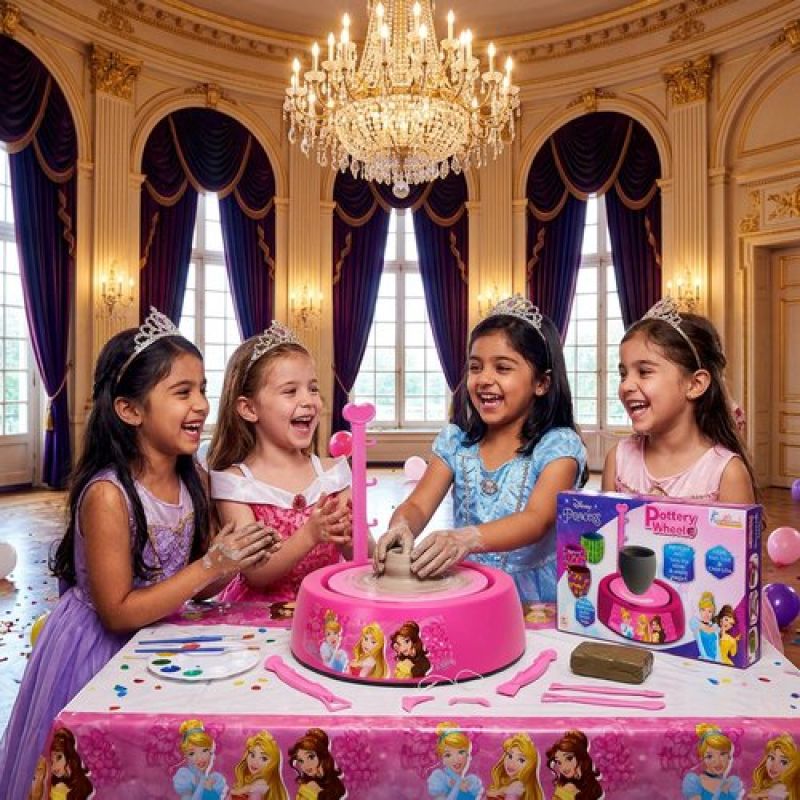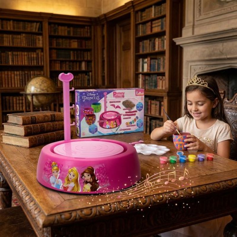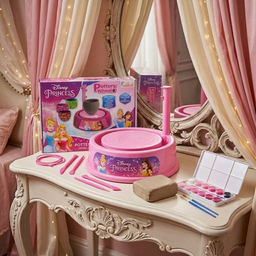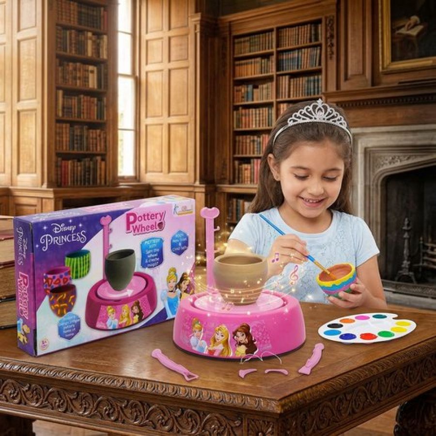 Disney Princess Theme Pottery Wheel Kit - Complete Fairy Tale Clay Art & Crafts Set with 800g Clay, 6 Acrylic Paints, Sculpting Tools & Music - Creative DIY Pottery Studio for Girls 8+ Years