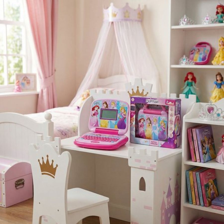 This Princess-themed educational laptop for kids is designed to make early pre-school learning joyful and engaging. It includes foundational activities like alphabet learning, word writing, spelling p