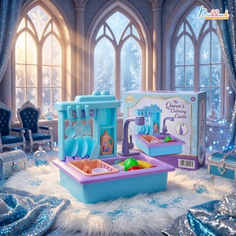 Kriiddaank Frozen Theme Kitchen Toy Set for Girls - Realistic Sink with Running Water, Electric Faucet, 22 Pcs Utensils & Accessories, Pretend Play Cooking & Baking Set for Kids Age 3+ (Turkish Blue)