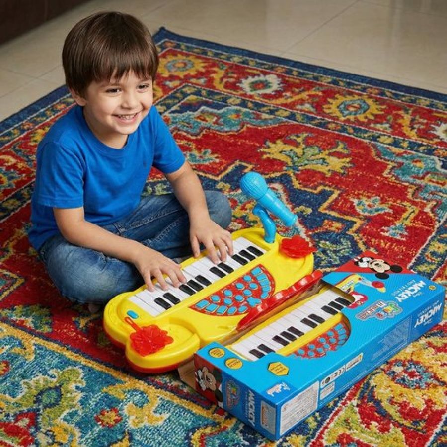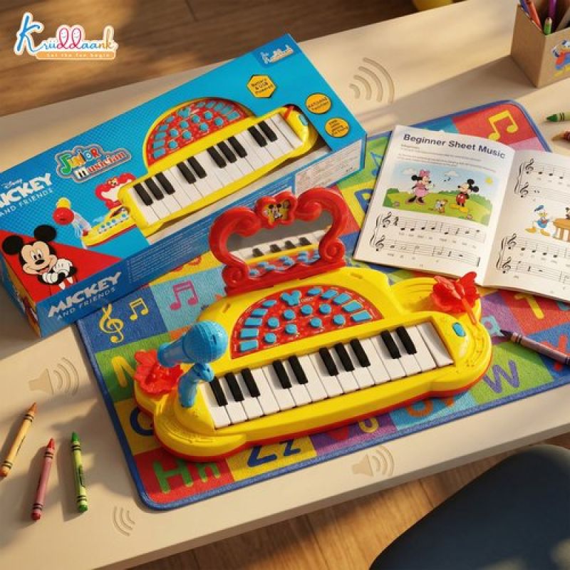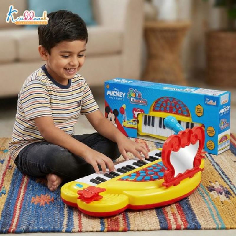 Mickey Mouse Theme Junior Musician Piano & Drum Set for Kids | Karaoke Microphone, 25 Songs & MP3 Connectivity | Early Learning Musical Toy for Toddlers 3+ | USB & Battery Powered (Red)