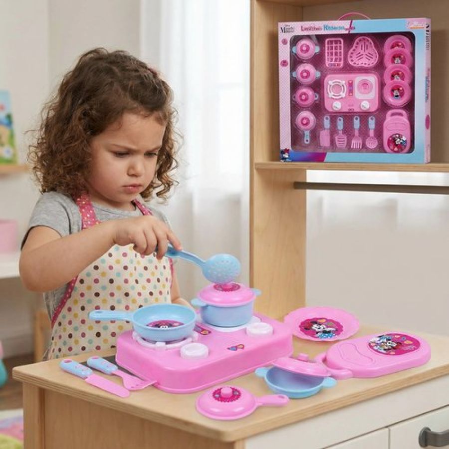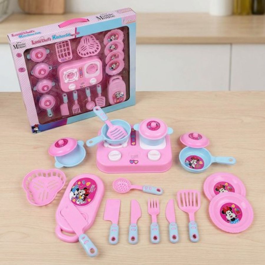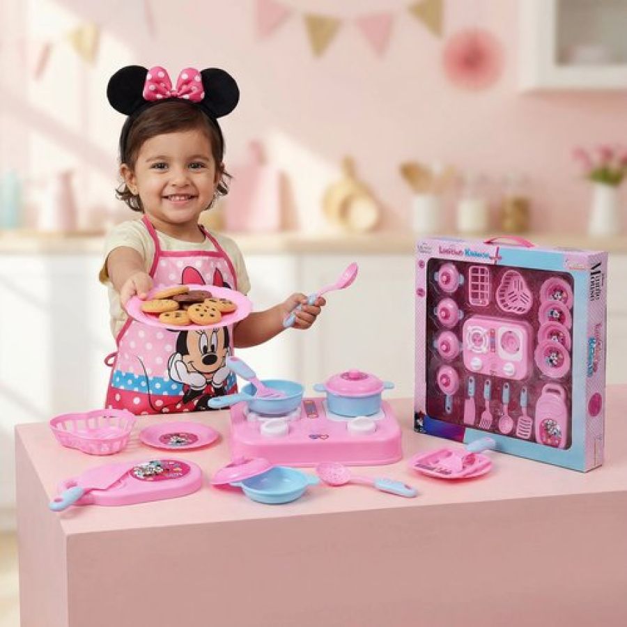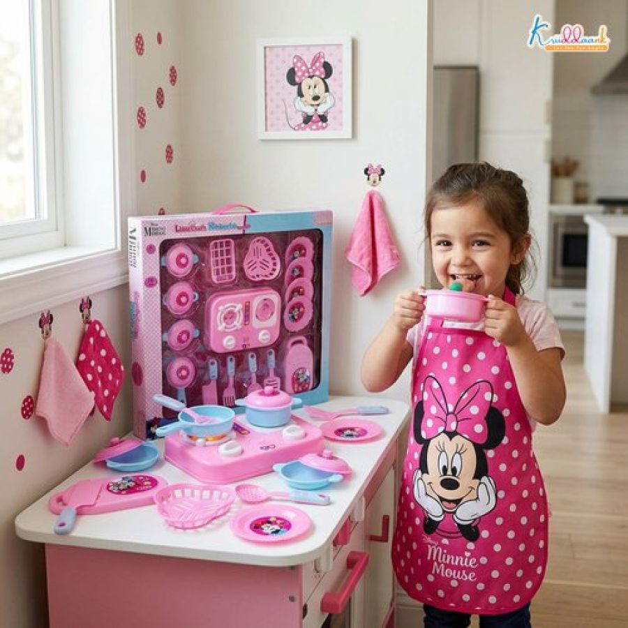 Kriiddaank Minnie Mouse Theme Little Chef's Kitchen Set for Girls - 16 Pcs Pretend Play Cooking Toy with Lights & Sound Effects, Portable Interactive Kitchen Playset for Kids Age 3+ Years (Pink)