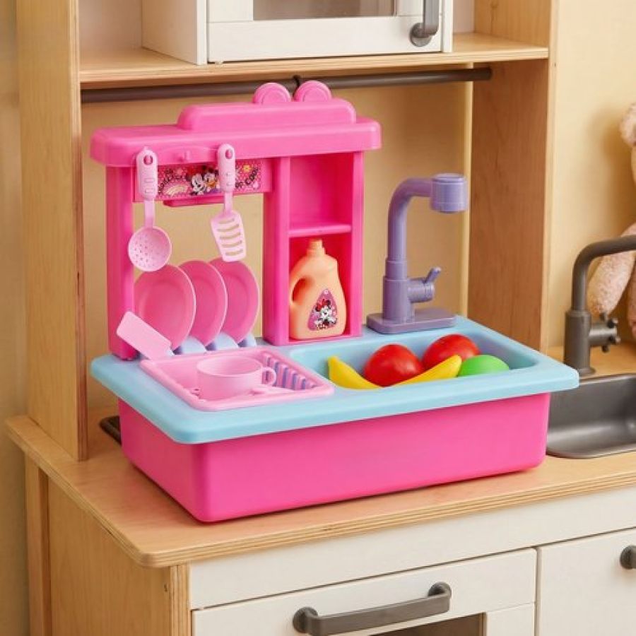 Kriiddaank Minnie Toy Kitchen Sink for Kids - Pretend Play Sink with Electric Faucet & Running Water, 22-Piece Kitchen Accessories Set, Pink Role Play Toy Set for Toddlers and Girls 3+ Years
