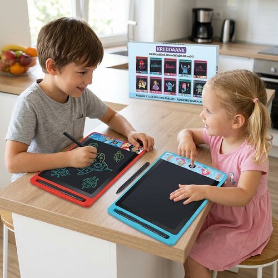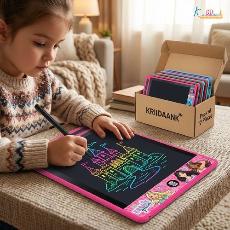 Unlock endless creativity with the KRIIDDAANK Pack of 12 LCD Writing Tablets. This bulk set of 8.5-inch colorful doodle boards is the ultimate solution for parents and educators looking for engaging, mess-free educational toys. Each electronic writing pad provides a smooth, paper-like experience perfect for drawing, practicing calculus, or spelling phrases. Designed with portability in mind, these ultra-slim and lightweight devices are travel essentials that keep children occupied during long car rides or flights. By choosing these reusable pads, you are making an environment-friendly choice that saves paper and reduces waste. Whether used as a classroom learning tool or high-quality return gifts for a birthday party, these tablets offer a fun and interesting way for kids aged 3 and up to learn and play.