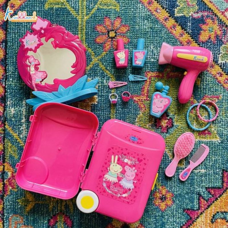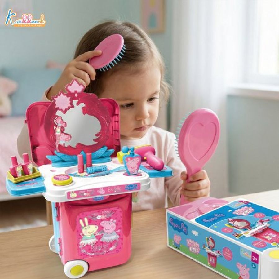 Kriiddaank Peppa Pig Dressing Set & Makeup Trolley Kit for Girls, 15 Pcs Pretend Play Beauty Set with Music & Lights, Educational Role Play Toy for Kids 3+ Years (Pink)