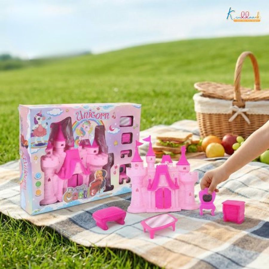 Portable Royal Castle Playset Unicorn Theme for Girls with Dollhouse Furniture, Mini Princess House Toy with Accessories, Educational Gift for Kids 3+ Years Old, Travel-Friendly & Safe