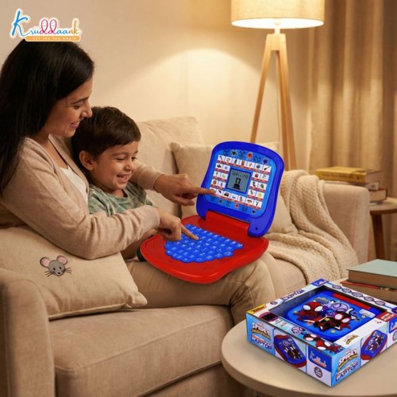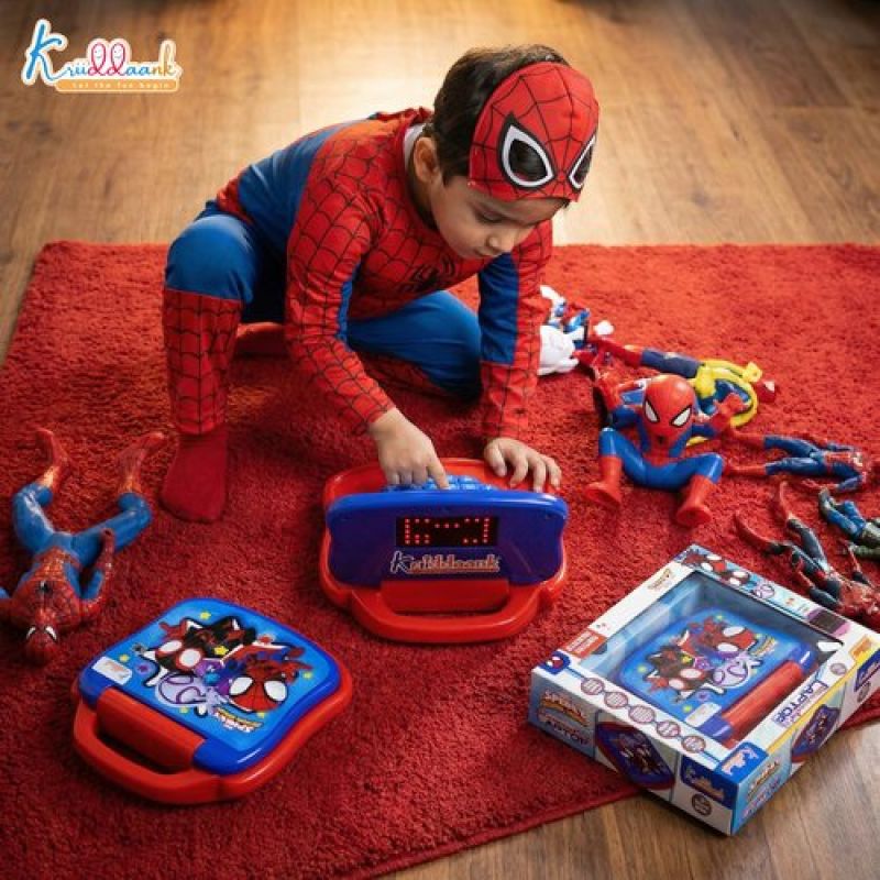 Spiderman-themed educational laptop for kids is designed to make early pre-school learning joyful and engaging. It includes foundational activities like alphabet learning, word writing, spelling pract