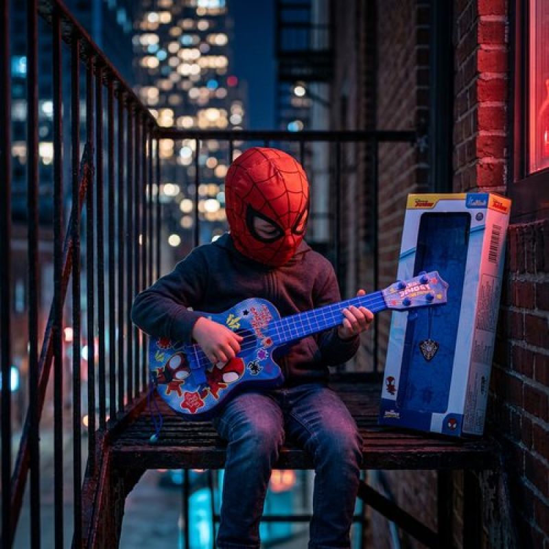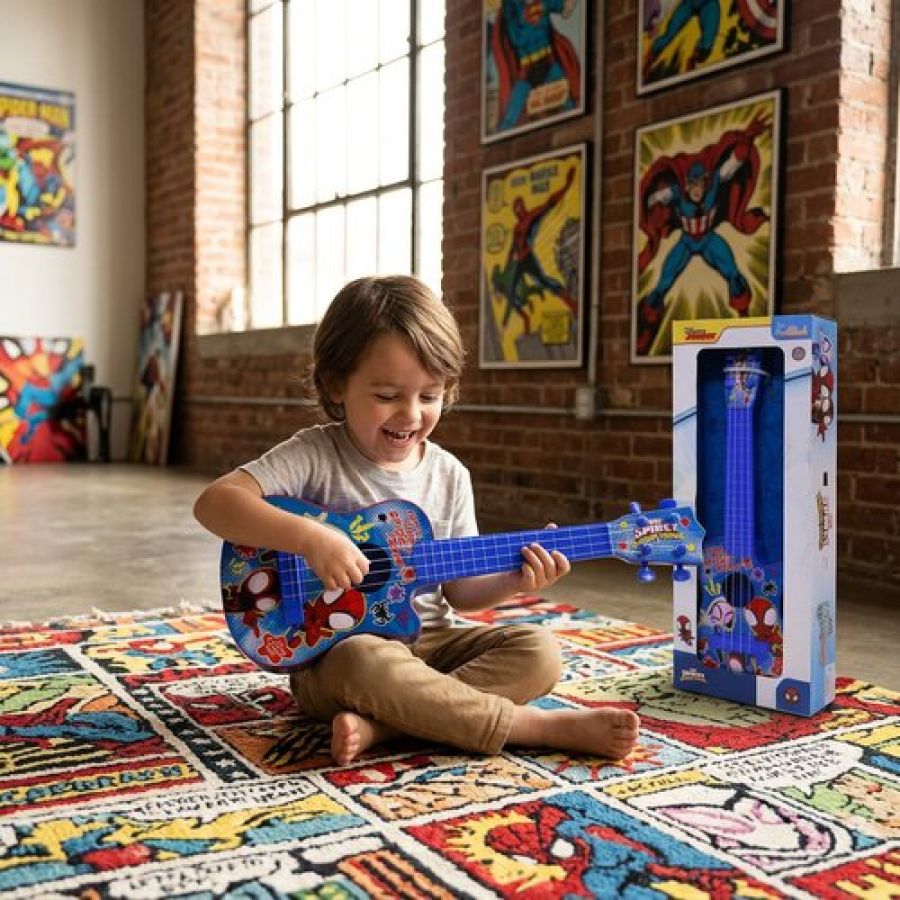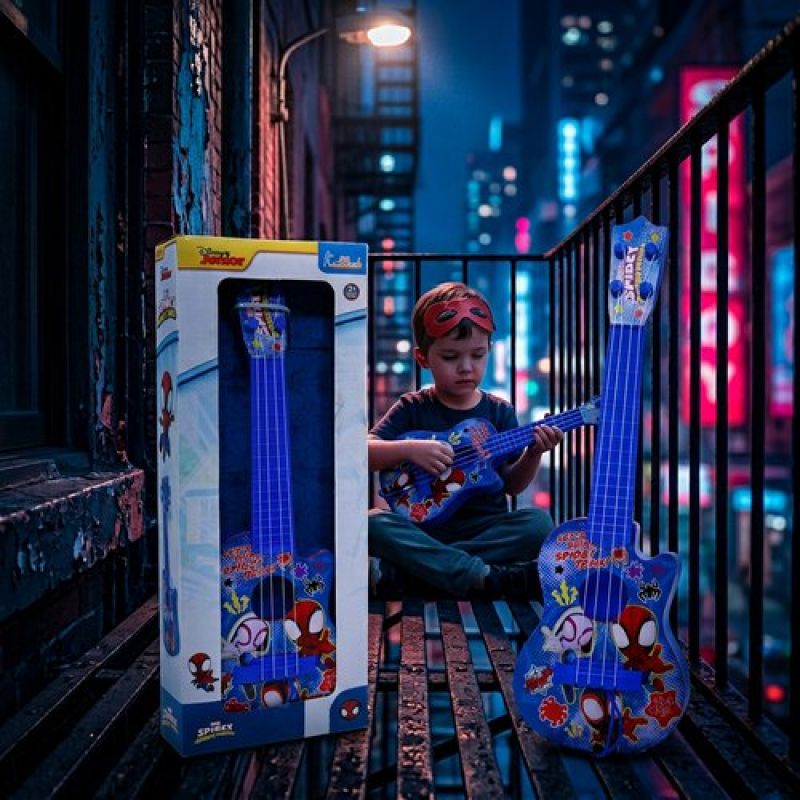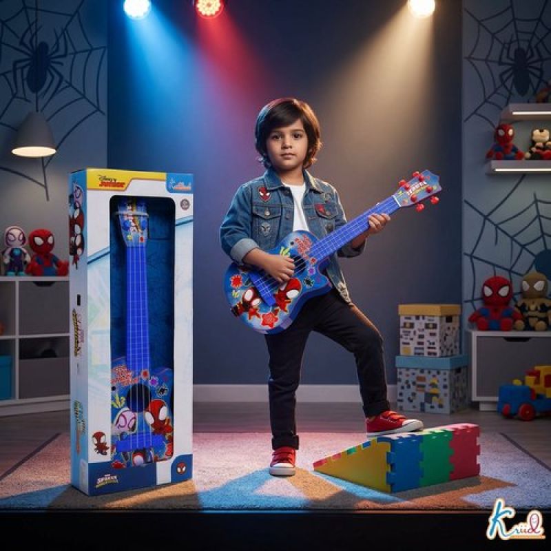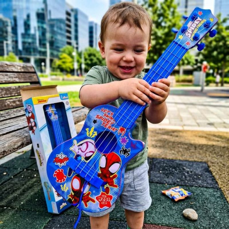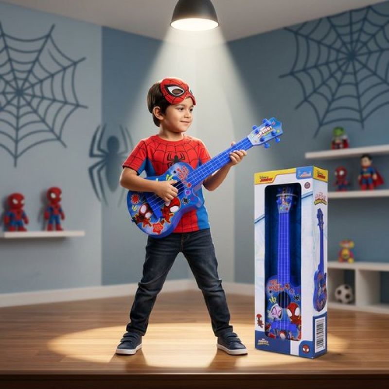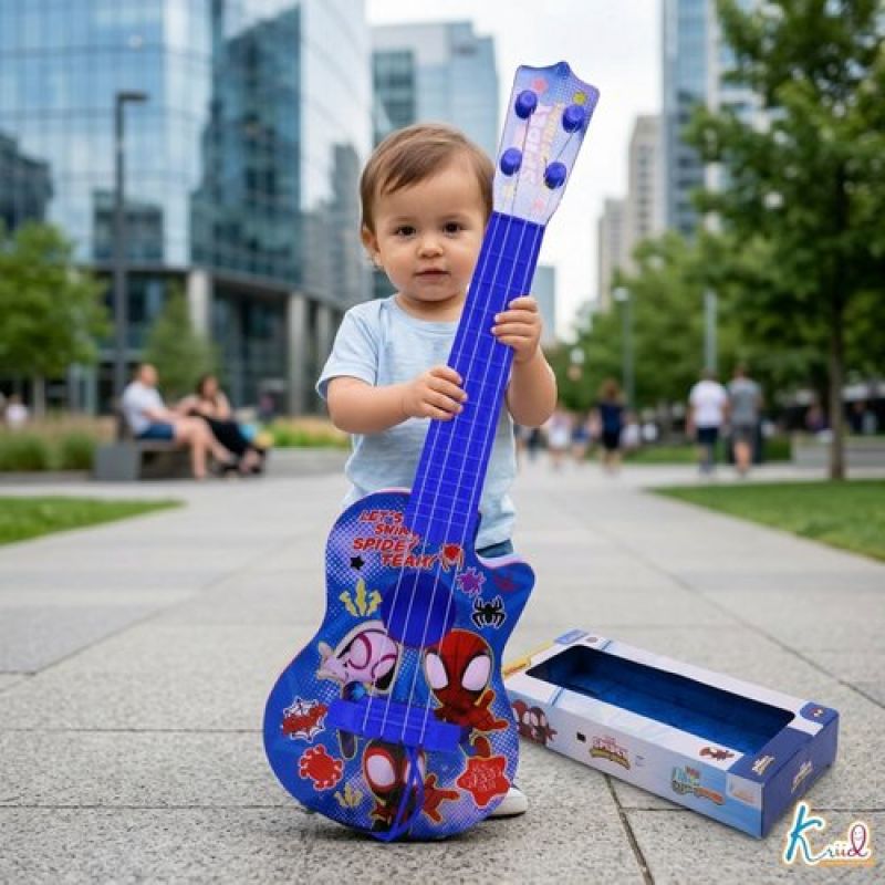 Spiderman 4-String Small Toy Guitar for Kids (3+ Years) - Adjustable String Tension, Fingerstyle Tab & Pick | Educational Musical Instrument for Boys | Portable & Safe Design, Blue
